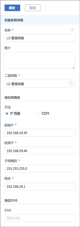 - 此管理网络与ZStack私有云中的管理网络为相同概念(即:管理物理机、主存储、镜像服务器的网络),如果已创建可直接复用。