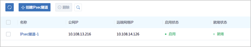- 在第一套环境中,创建IPsec隧道,指定第一套网络的本地公网IP、并指定本地可用的私有网络,输入第二套网络指定的公网IP作为远端IP,并输入第二套网络指定的私有网络作为远端网路;