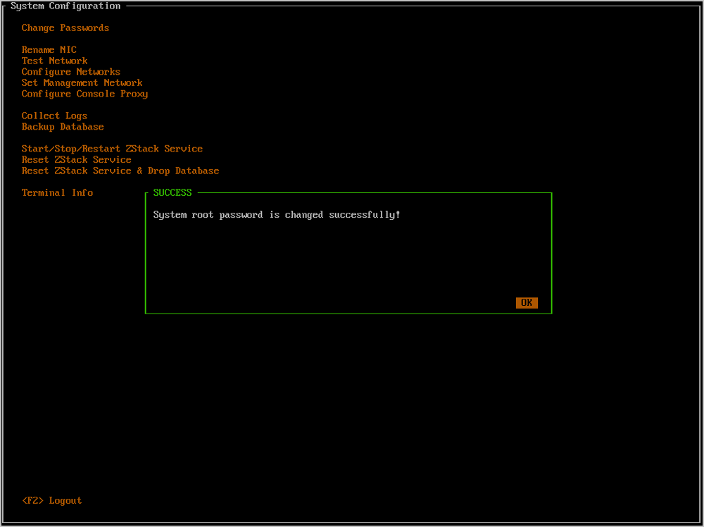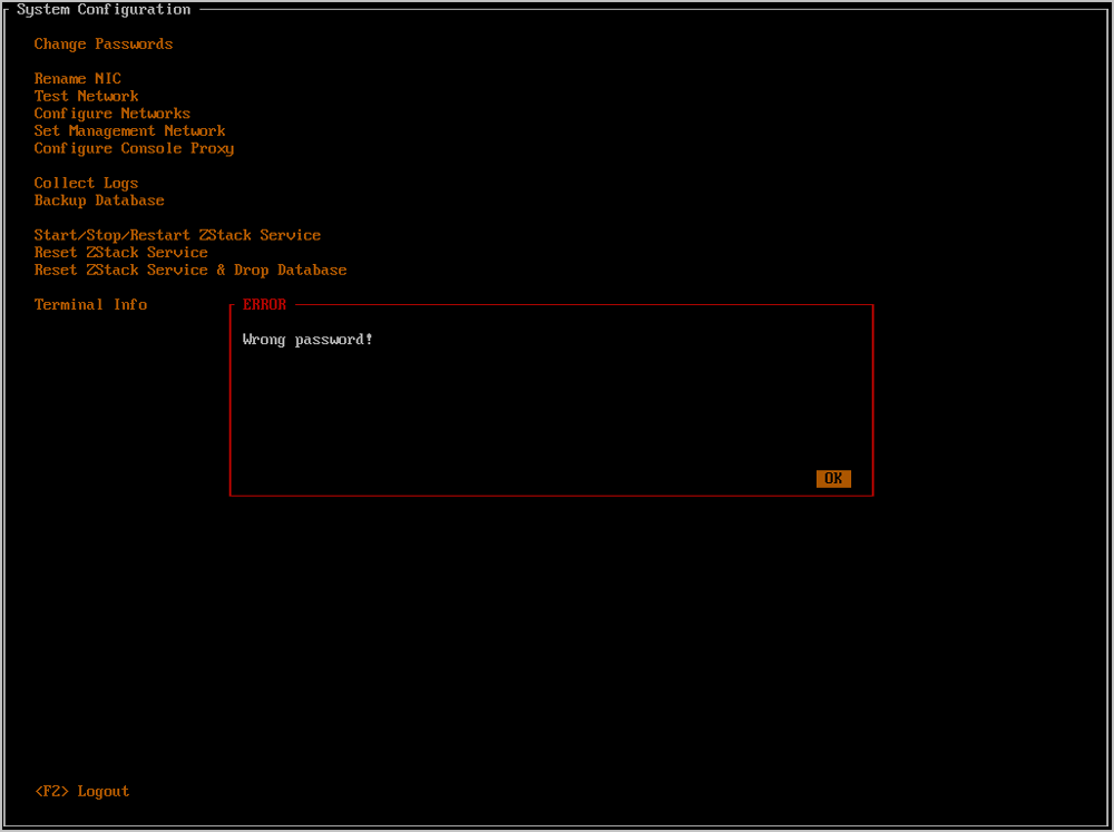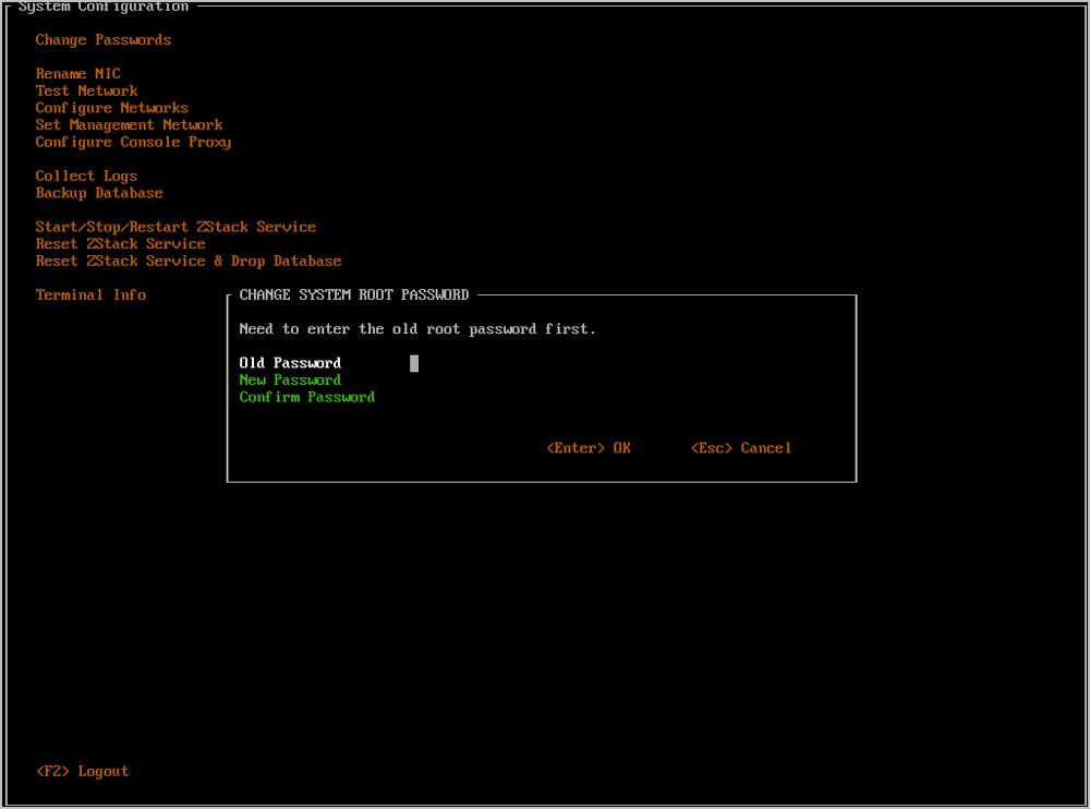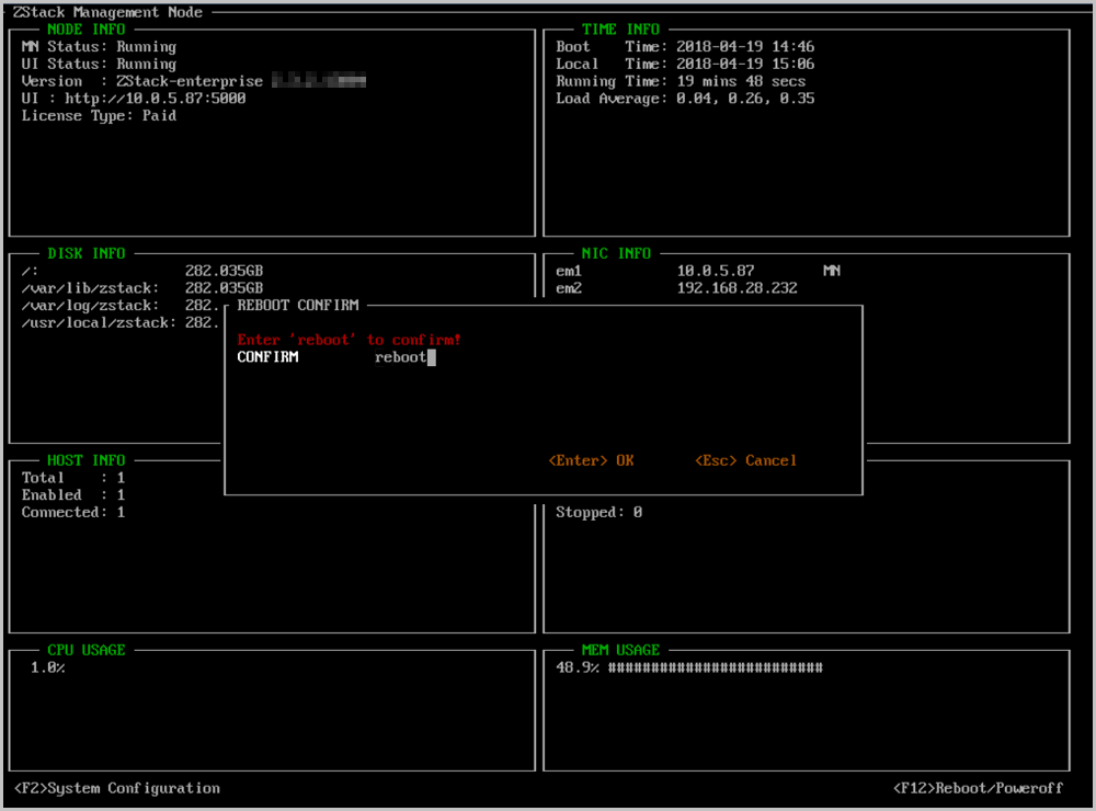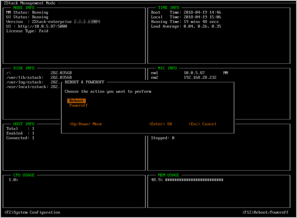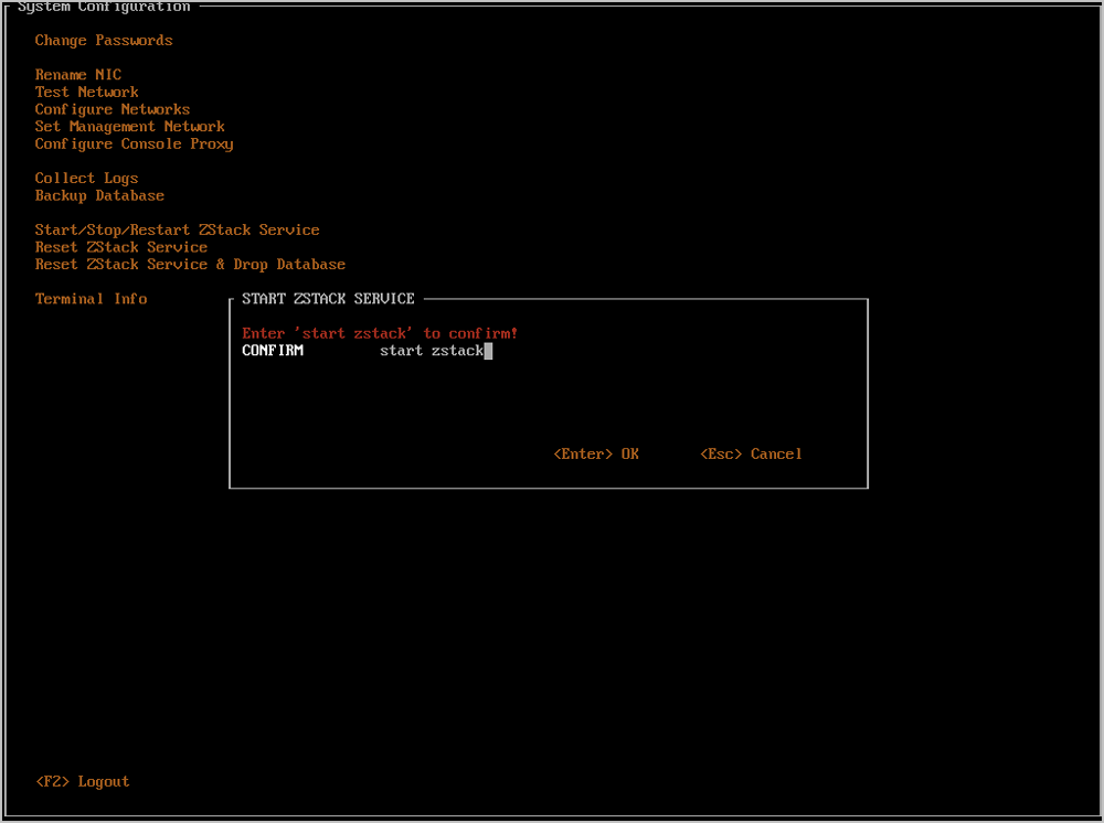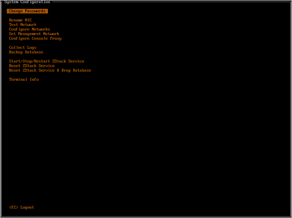 - 任何时候都可以通过按下Ctrl + Alt + F1返回ZStack TUI。如Figure 32所示