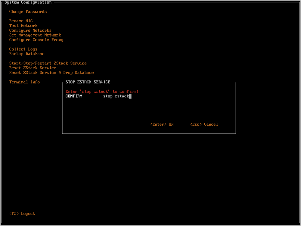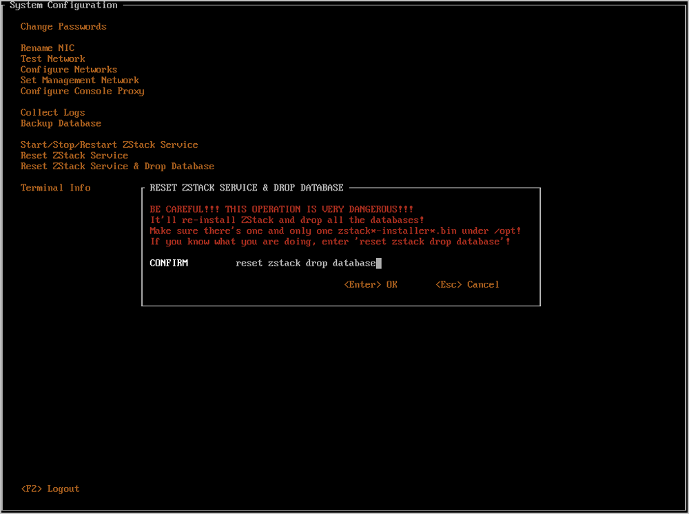 将光标移动至Reset ZStack Service&Drop Database处,按下回车,即可进入重置ZStack和数据库窗口。