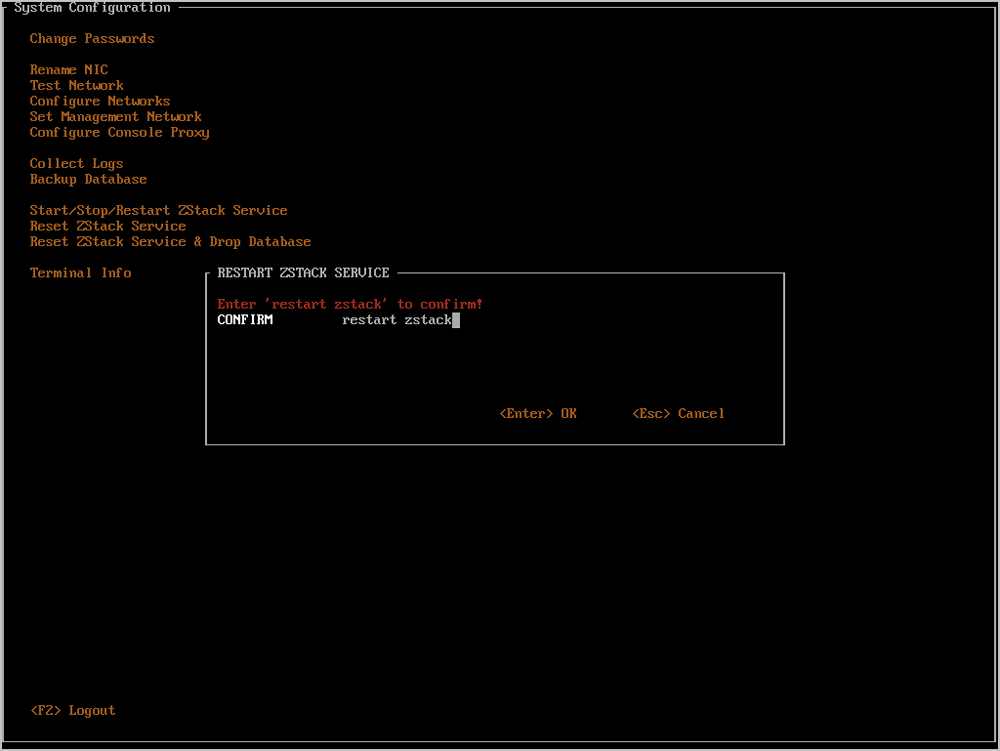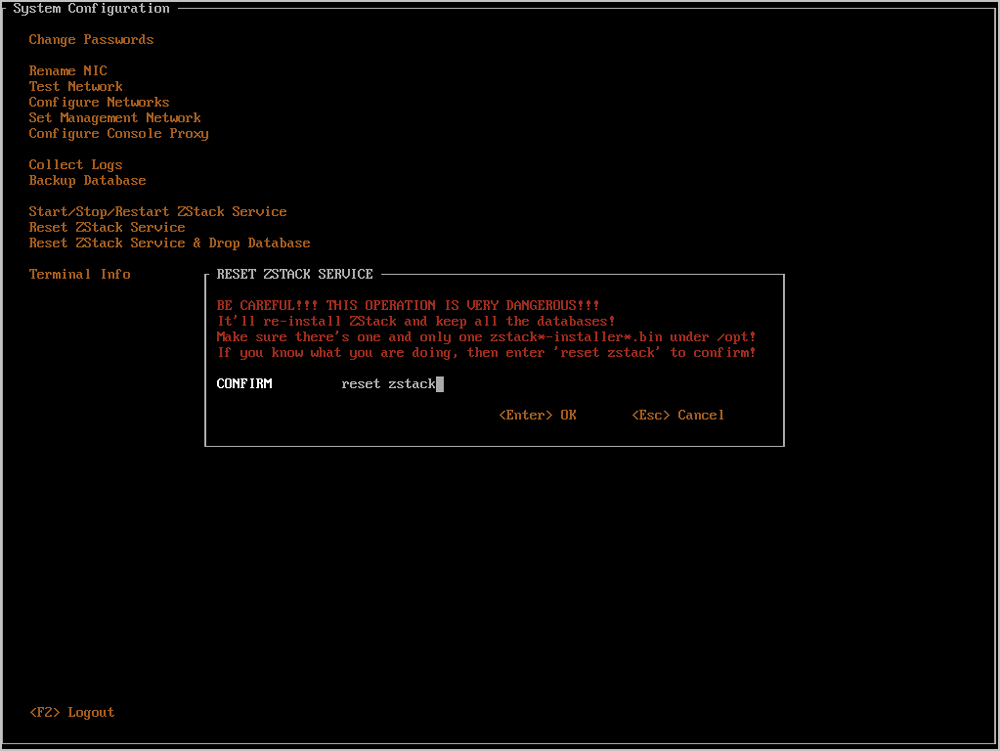 将光标移动至Reset ZStack Service,按下回车,即可进入重装ZStack服务窗口。