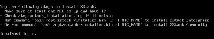 - 按下Ctrl + Alt + F3可以进入zstack-cli命令行界面。