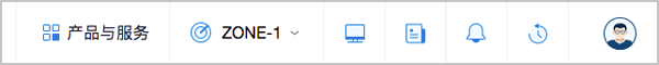 在UI界面右上角从左到右的按钮依次为:产品与服务快速入口按钮、区域切换按钮、大屏监控入口按钮、工单消息按钮(Plus)、最近消息按钮、最近操作按钮、个人中心按钮,如Figure 2所示(已安装企业管理模块许可证):Figure 2. UI界面右上角按钮
