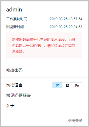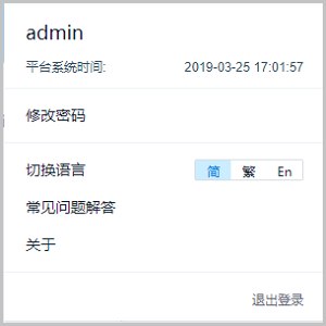 - 个人中心:支持查看平台系统时间、修改登录密码、UI界面语言切换、跳转查看常见问题解答/关于界面、以及登出操作,如Figure 3所示: