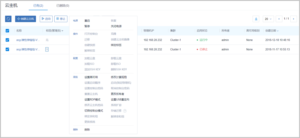 在云主机管理界面,已有页面支持的批量操作有:启动、停止、重启、暂停、关闭电源、绑定标签、设置高可用、修改计算规格、更改所有者、设置RDP模式、设置USB重定向、切换控制台模式、删除等操作,如Figure 1所示:Figure 1. 已有页面批量操作云主机