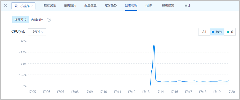 外部监控是Libvirt从物理机处获取的云主机性能数据,通过曲线图实时动态展示云主机的各项性能指标,包括:CPU、内存、磁盘IO、网卡。