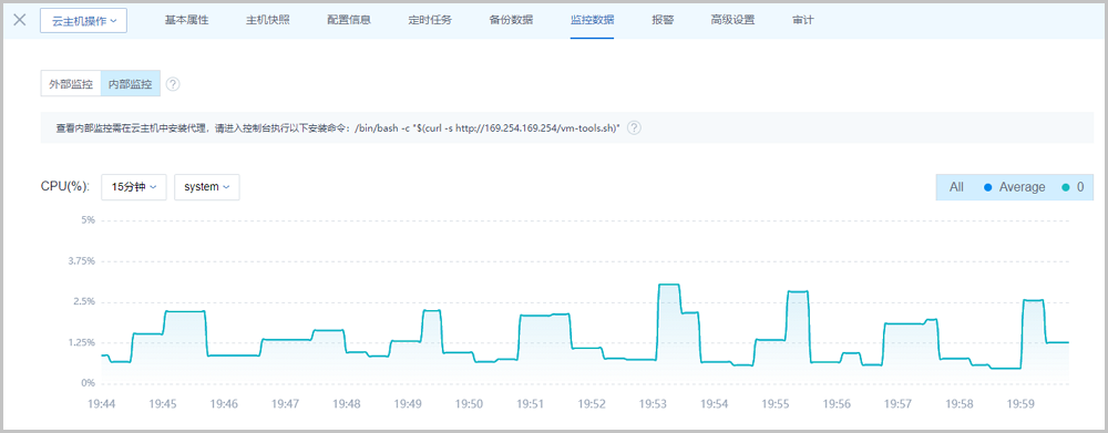 查看内部监控需在云主机中安装agent,agent是安装在云主机内的代理,定时通过内部网络推送云主机监控数据到物理机。请进入控制台执行以下命令进行安装: