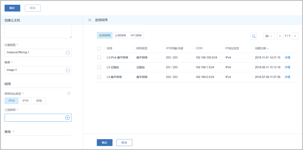 - 若网络地址类型选择IPv4,需要继续选择三层网络,支持选择私有网络、公有网络和VPC网络,如Figure 1所示: