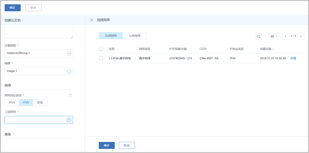 - IPv6网络:选择一个IPv6网络,支持选择私有网络和公有网络