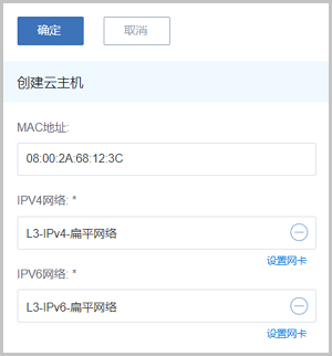 点击确定按钮,完成网卡添加,退回到创建云主机界面。Note:- 网络地址类型为双栈时,每张网卡上的IPv4网络、IPv6网络必须在同一个二层网络;