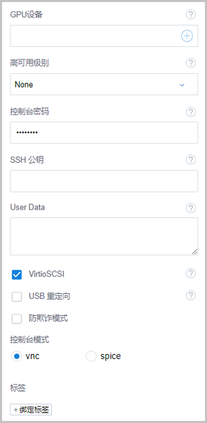 - 控制台模式:打开控制台使用的模式,支持vnc、spice,默认为vnc