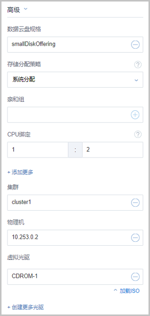 - 虚拟光驱:为云主机创建更多虚拟光驱点击创建更多光驱可创建更多虚拟光驱,点击添加ISO可为虚拟光驱加载ISO。