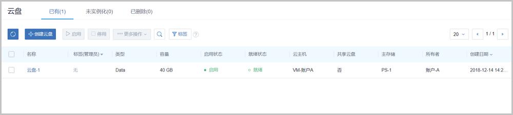- 启用:将处于停用状态的云盘启用。支持批量操作。