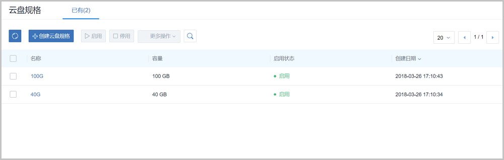 - 启用:将处于停用状态的云盘规格启用。支持批量操作。