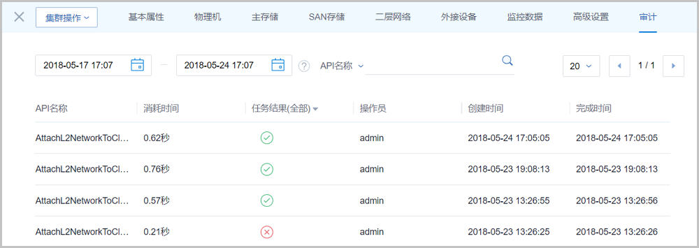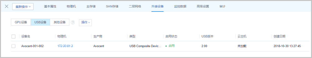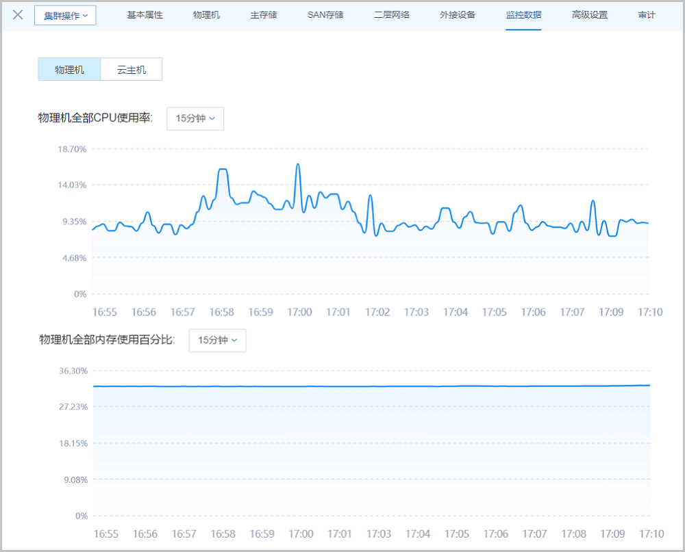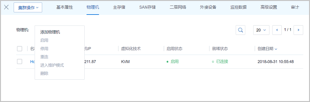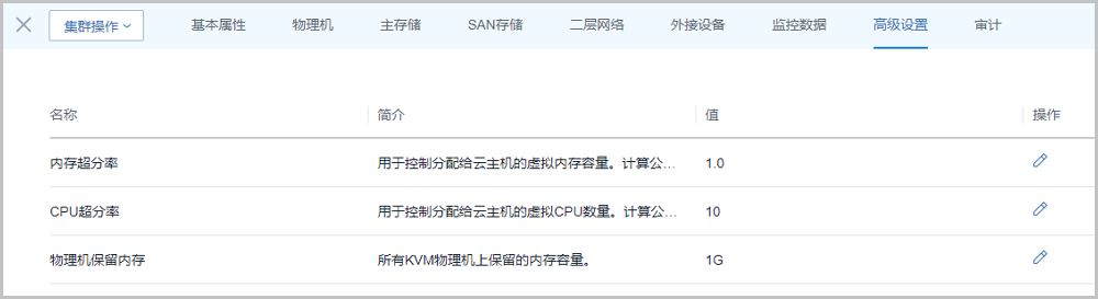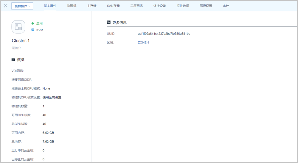 在集群管理界面,点击相应集群的名称,可以展开集群详情页。包含:基本属性、物理机、主存储、二层网络、外接设备、监控数据、高级设置和审计。