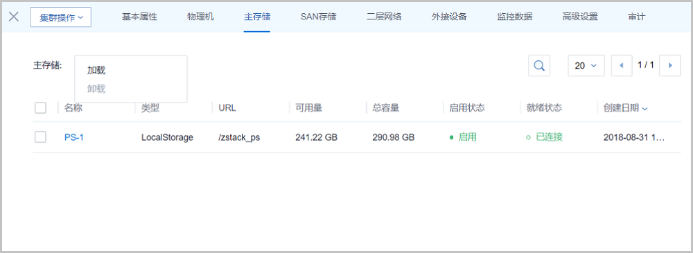 - 主存储:主存储栏列出了当前集群中所加载的主存储列表。主要显示了主存储的名称、类型、URL、容量和状态等。在此栏可以点击主存储后边的操作按钮来操作主存储,包括:加载主存储到集群、从集群卸载主存储。Note: 从集群卸除主存储,将关闭所有使用本存储的云主机和云路由器,且此存储的所有云盘将不能正常使用。如Figure 3所示: