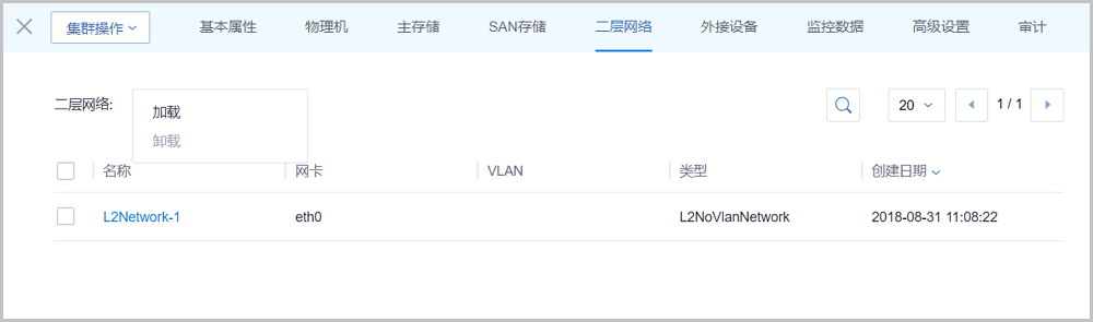 - 二层网络:二层网络栏列出了当前集群中所加载的二层网络列表。主要显示了二层网络的名称、网卡、VLAN号和类型等。在此栏可以点击二层网络后边的操作按钮来操作二层网络,包括:加载二层网络到集群、从集群卸载二层网络。如Figure 5所示: