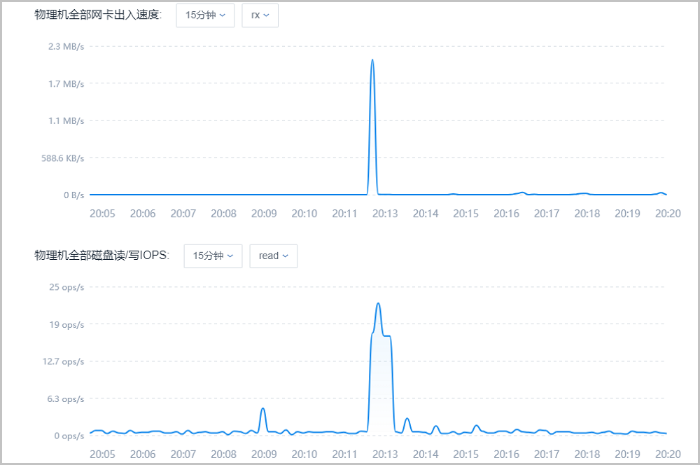 - 监控数据:监控数据页面显示了物理机或云主机的全部CPU使用率、全部内存使用百分比、全部网卡出入速度和全部磁盘读/写IOPS,可通过下拉菜单切换监控条目。