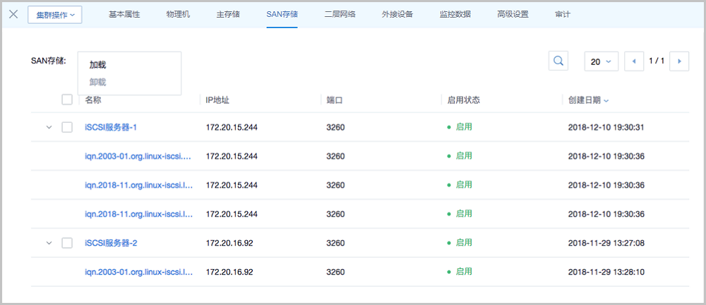 - SAN存储:SAN存储栏列出当前集群中所加载的iSCSI-SAN存储列表。主要显示iSCSI-SAN存储的名称、虚拟化技术、物理机数量、启用状态等信息。在此栏可以点击iSCSI-SAN存储后面的操作按钮来操作iSCSI-SAN存储,包括:加载iSCSI-SAN存储到集群、从集群卸载iSCSI-SAN存储。如Figure 4所示: