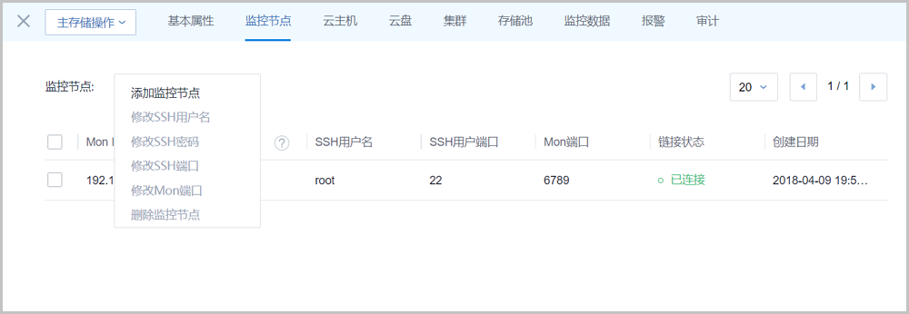 - 在主存储界面,选中某一Ceph主存储进入其详情页,单击监控节点,进入监控节点子页面,如Figure 2所示: