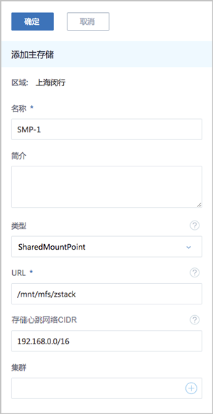 在ZStack私有云主菜单,点击按钮,进入主存储界面,点击添加主存储按钮,弹出添加主存储界面,可参考以下示例输入相应内容: