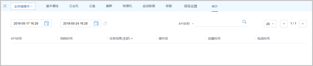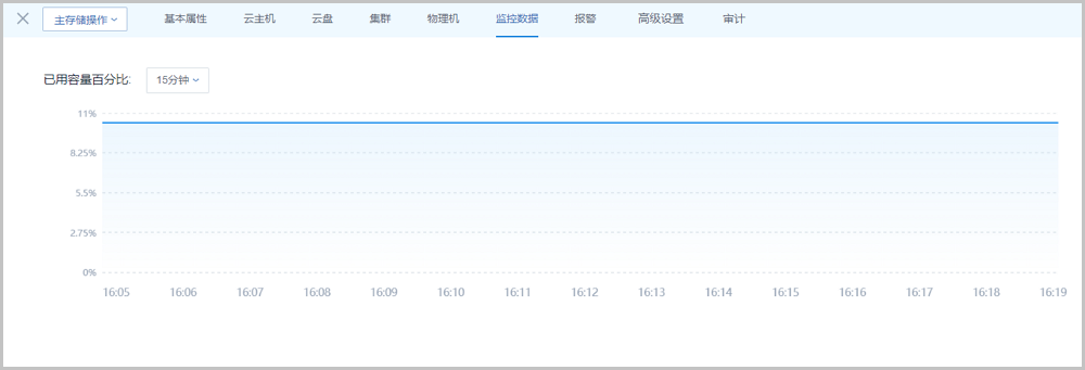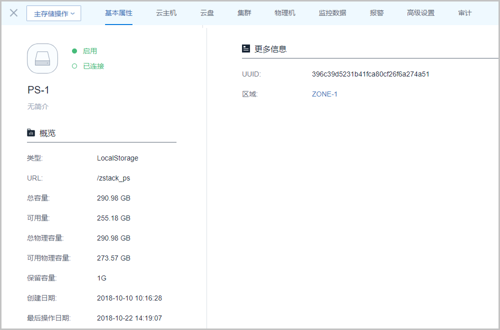 本地存储类型的主存储详情页包括:基本属性、云主机、云盘、集群、物理机、监控数据、报警、高级设置和审计。