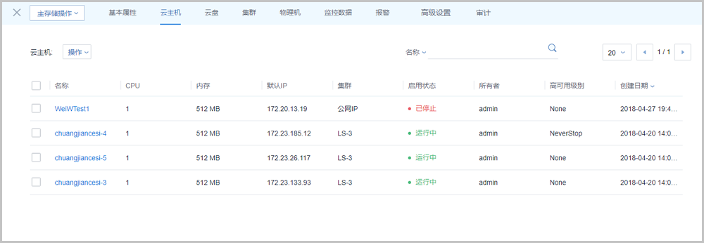 该子页面列出了当前主存储上创建的所有云主机列表,显示了云主机的名称、计算规格、默认IP、所属集群、状态等。点击云主机旁的操作按钮,可对云主机进行各种操作。