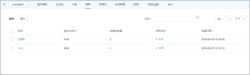 该子页面显示了加载当前主存储的集群列表。列表显示了集群的名称、虚拟化技术、物理机数量、状态等。点击集群旁的操作按钮,可对集群进行各种操作。