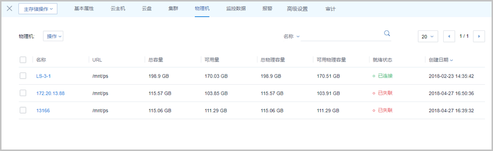 该子页面显示了提供当前主存储的物理机列表,列表显示了物理机的名称、URL、容量和状态等。如果物理机失联,可点击物理机旁的按钮,对物理机进行重连。