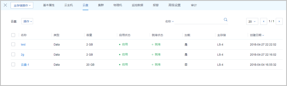 该子页面显示了当前主存储上创建的所有云盘列表,包括根云盘和数据云盘。列表显示了云盘的名称、类型、容量、状态、加载情况等。点击云盘旁的操作按钮,可对云盘进行各种操作。