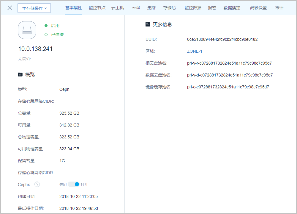 Ceph类型的主存储详情页包括:基本属性、监控节点、云主机、云盘、集群、存储池、监控数据、报警、数据清理、高级设置和审计。