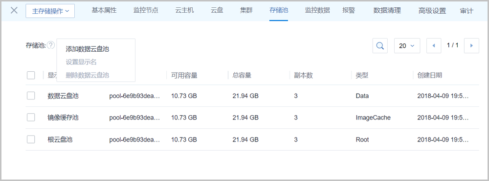 - 删除数据云盘池:删除数据云盘池,仅删除本地记录,Ceph存储中的真实资源不受影响