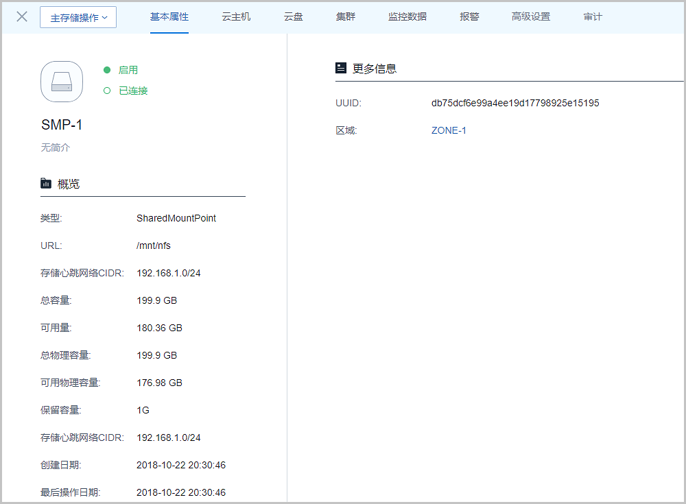 SMP类型的主存储详情页包括:基本属性、云主机、云盘、集群、监控数据、报警、高级设置和审计。