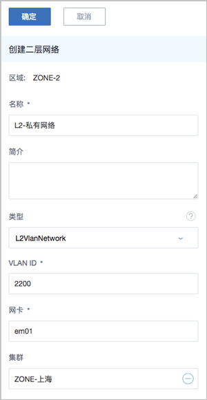 在ZStack私有云主菜单,点击,进入二层网络界面,点击创建二层网络,在弹出的创建二层网络界面,可参考以下示例输入相应内容: