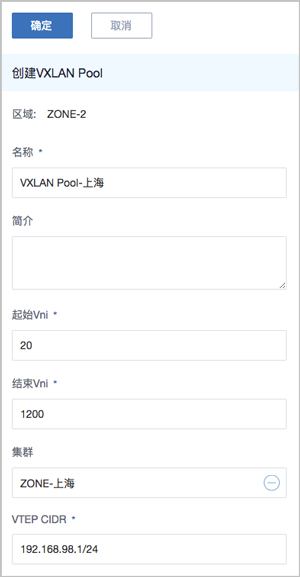 - 结束Vni:VxlanNetwork的结束ID,可输入1-16777214之间的数字,需大于或等于起始VniNote: ZStack将最后两个Vni(即:16777215、16777216)作为系统保留。