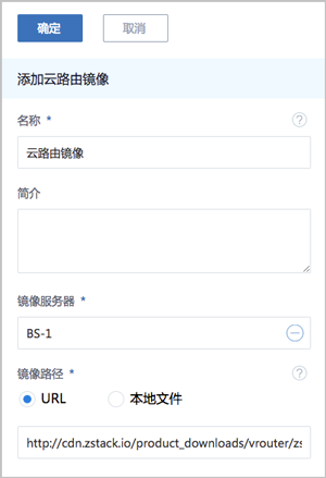 在ZStack私有云主菜单,点击 ,进入云路由镜像界面,点击添加云路由镜像,在弹出的添加云路由镜像界面,可参考以下示例输入相应内容: