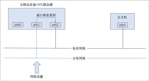 - 端口转发规则创建于云路由器/VPC路由器公有网络和云主机私有网络之间,如Figure 1所示: