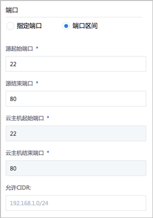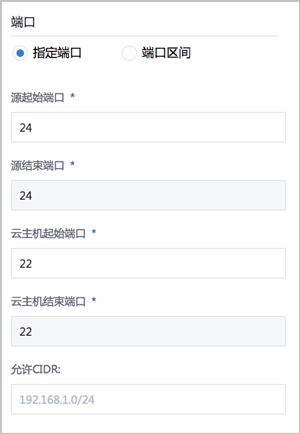 - 云主机结束端口:系统自动填写,默认与源结束端口一致