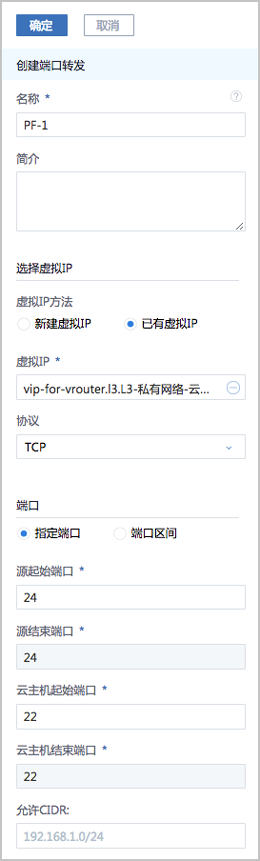 在私有云界面,点击,进入端口转发界面,点击创建端口转发,在弹出的创建端口转发界面,可参考以下示例输入相应内容: