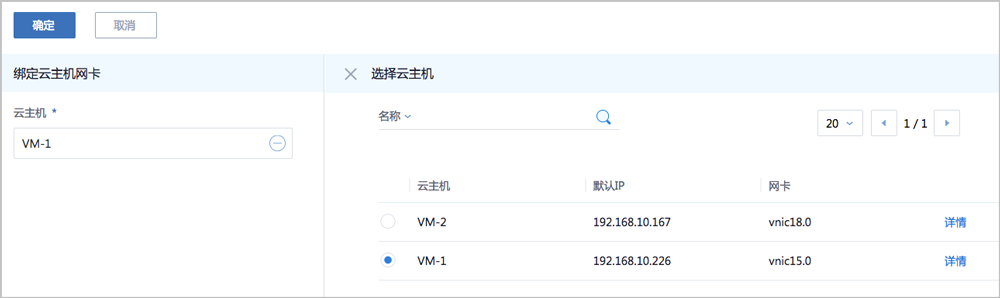 弹出绑定云主机网卡界面,点击云主机栏里的加号按钮,弹出选择云主机界面,选择需绑定的云主机网卡,点击确定。
