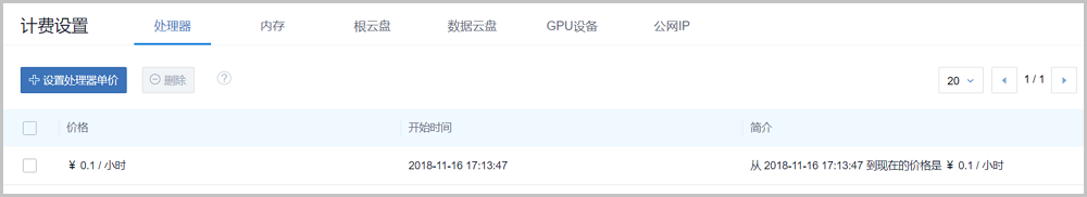 - 支持对处理器、内存、根云盘、数据云盘、GPU设备、公网IP等基本计费资源进行计费单价设置。