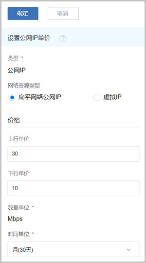 在计费设置的公网IP子页面,点击设置公网IP单价按钮,可参考以下示例输入相应内容:Figure 7. 设置公网IP计费单价
