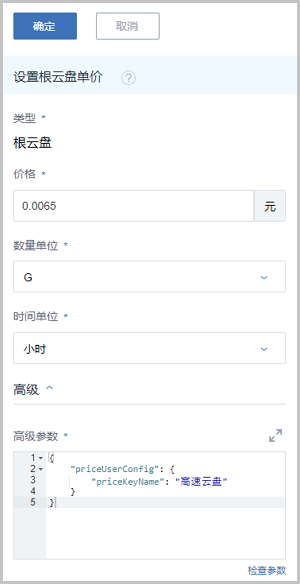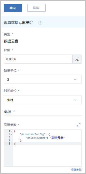 { "priceUserConfig": { "priceKeyName": "高速云盘" } }Note: 此配置条目依赖云盘规格高级参数中的priceUserConfig信息,请确保配置严格一致,否则不能生成计费账单。