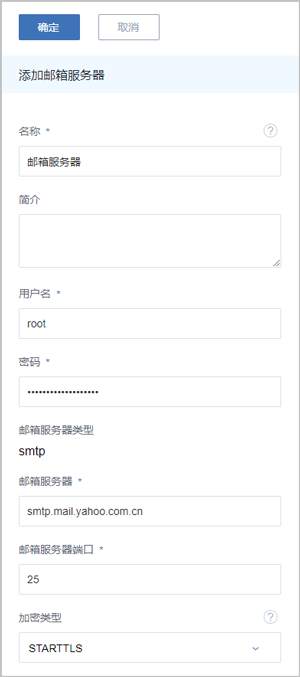 - 加密类型:可选项,支持对邮箱服务器端口设置加密连接,加密类型有:STARTTLS、SSL/TLS、NONENote: