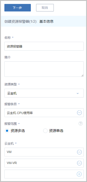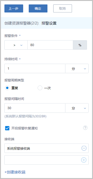 创建资源报警器分为以下两步,可参考以下示例输入相应内容: