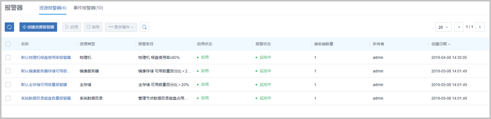 在资源报警器页面,系统提供一些默认资源报警器,如下: