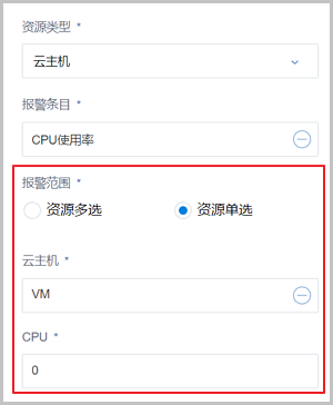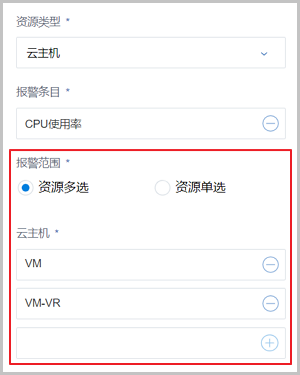 - 报警范围:所选报警条目既涉及批量资源也涉及单个资源时,支持选择报警范围,包括:资源多选、资源单选