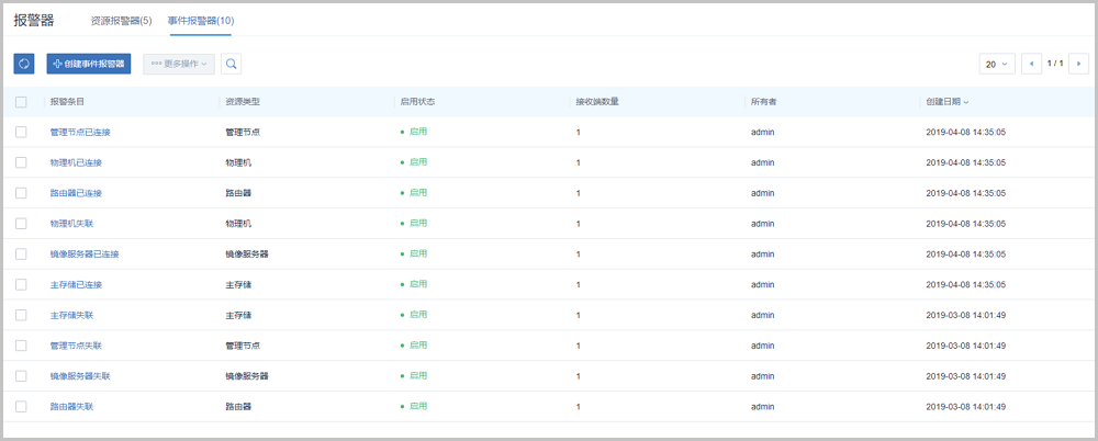 - 管理节点已连接:默认管理节点已连接报警器。默认监控云平台所有管理节点。任意管理节点从失联状态恢复连接,即可触发报警。默认触发云平台消息通知,绑定接收端之后,可通过接收端接收报警消息