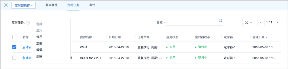 - 定时任务定时任务子页面不仅可查看该定时器上加载的定时任务信息,还可对定时任务进行相关操作,包括:创建定时任务、启用定时任务、停用定时任务、加载定时任务到定时器、将定时任务从定时器卸载、删除定时任务。如Figure 4所示: