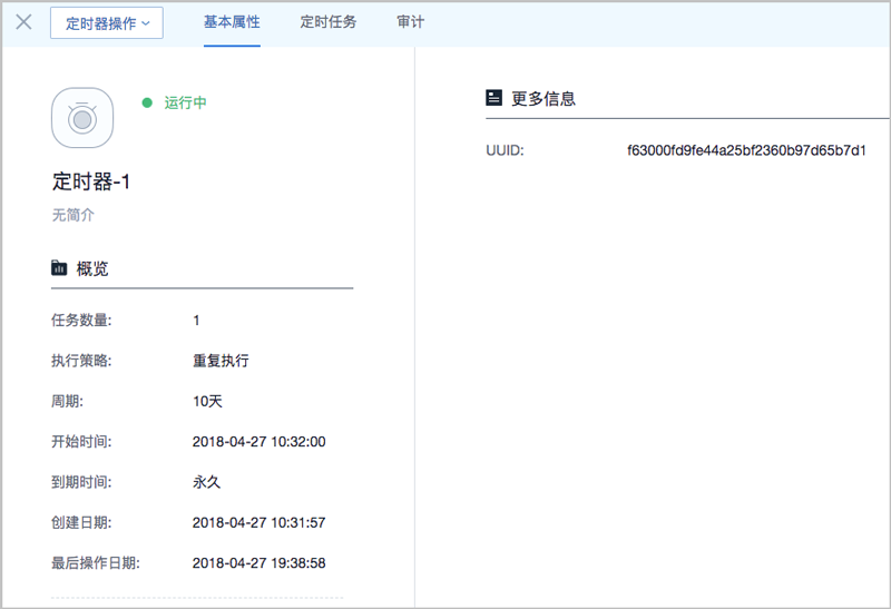 定时器详情页包括基本属性、定时任务和审计三个子页面。